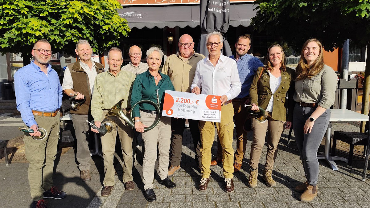 Mit tatkräftiger Unterstützung der Holzwerke van Roje GmbH & Co. KG wurden in gemeinsamer Arbeit Drückjagdböcke gebaut. Diese wurden anschließend innerhalb der ortsansässigen Jagdreviere verkauft. Der Erlös dieser Aktion kam der „VOR-TOUR-der-Hoffnung“ zugute - einer Initiative, die sich für krebskranke und hilfsbedürftige Kinder einsetzt. Die Freude war groß als die stolze Spendensumme von 2.200 Euro am 8. Juli 2025 im Hotel zur Post Waldbreitbach übergeben werden konnte. Die Verantwortlichen des Hegerings und der Jagdhornbläsergruppe zeigten sich begeistert vom Engagement aller Beteiligten.