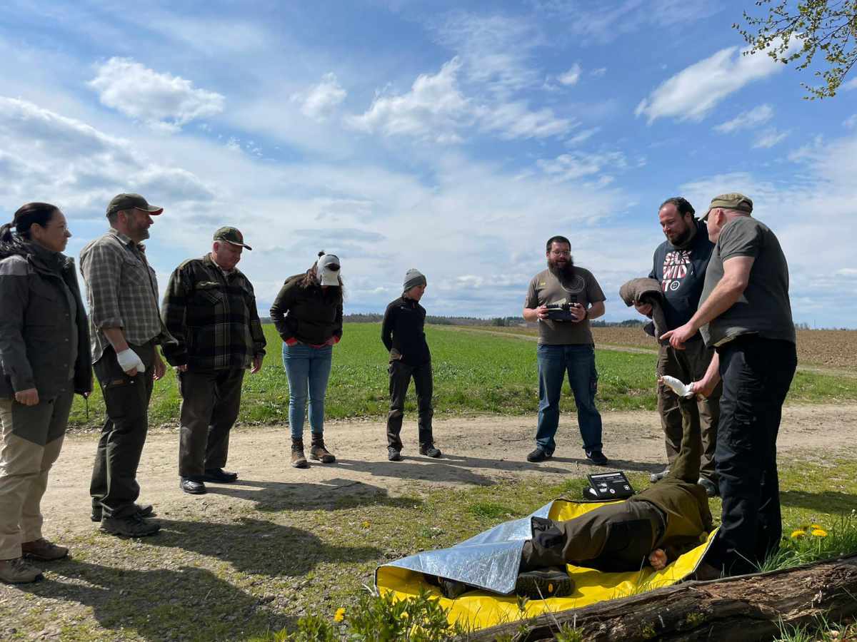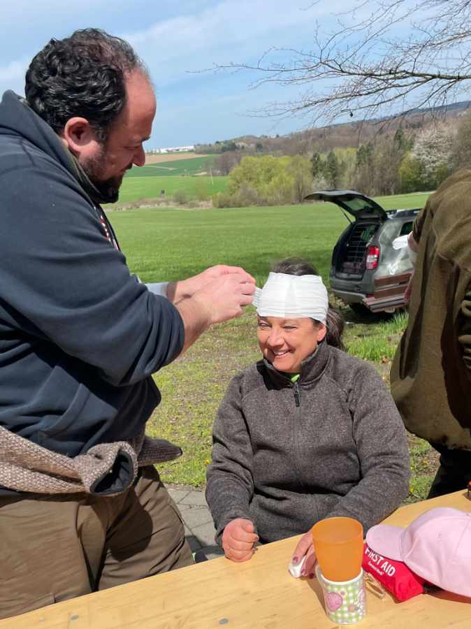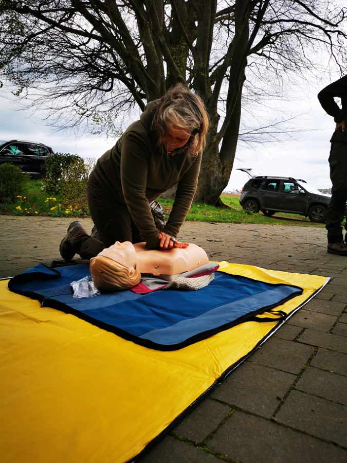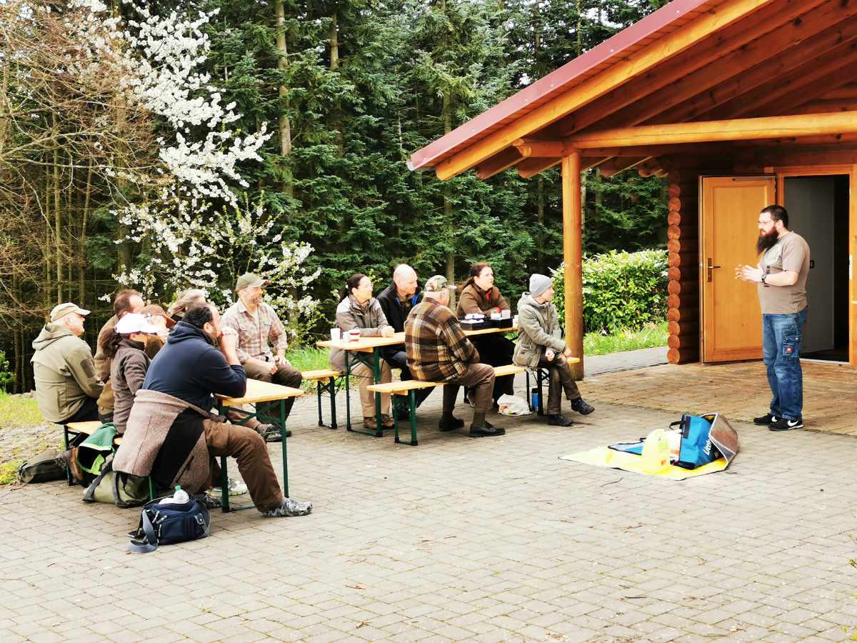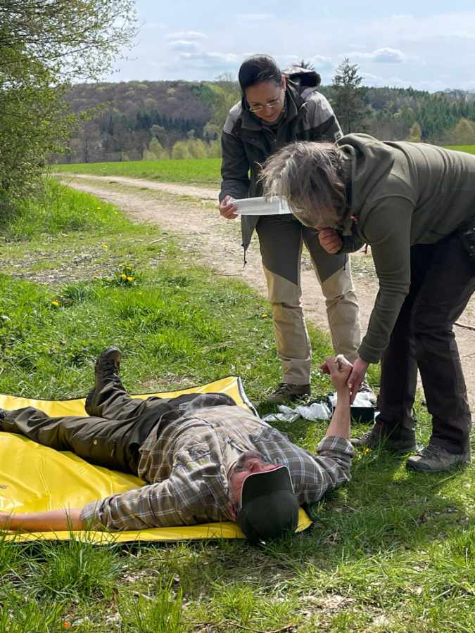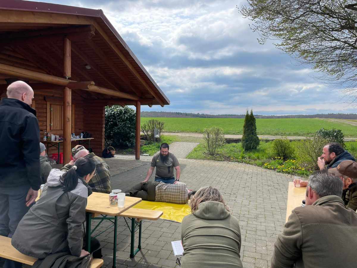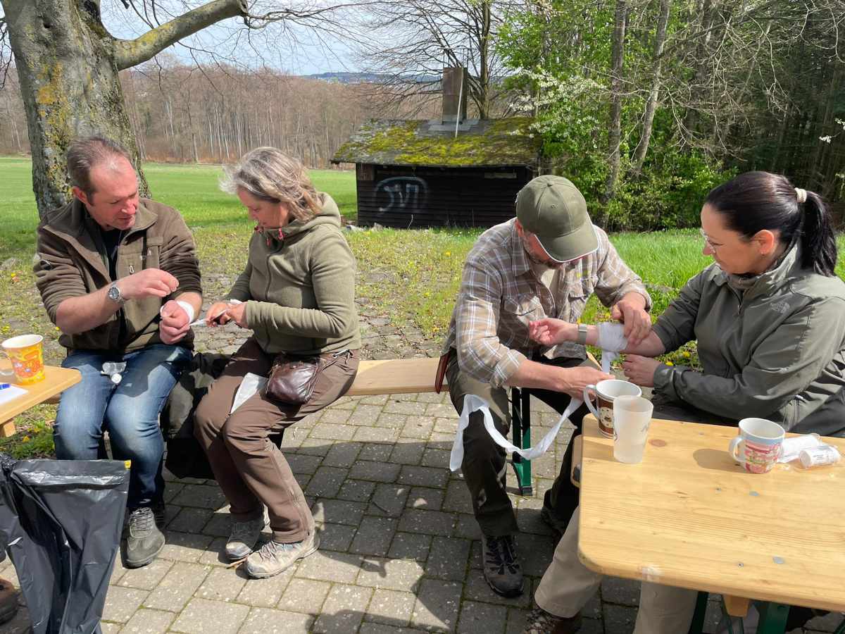 Im Ernstfall adäquat Hilfe leisten zu können, das war das Hauptanliegen der Teilnehmer*innen, die am 1.Hilfe Kurs Outdoor teilnahmen. Die Grillhütte in Meinborn boten einen schönen Rahmen für den ganztägigen Kurs. Nachdem Tim Baldus von https://outdoor-westerwald.de/ zunächst die rechtlichen Grundlagen zur Ersten Hilfe erklärte, ging es schnell mit praktischen Übungen weiter. Berücksichtigt wurden Unfälle im Wald und bei der Jagd, z.B. Stock im Auge, Messer in der Hand oder abgetrennter Finger. Die Teilnehmenden konnten natürlich auch die klassischen Inhalte eines Erste Hilfe Kurses erlernen, darunter Verbände an verschiedenen Körperstellen anlegen, Reanimation und sogar die Handhabung eines Defibrillators. Es wurde viel gelacht und die Gruppe nutze die Pausen, bei Kaffee und Kuchen, zum Austausch auch über jagdliche Themen.